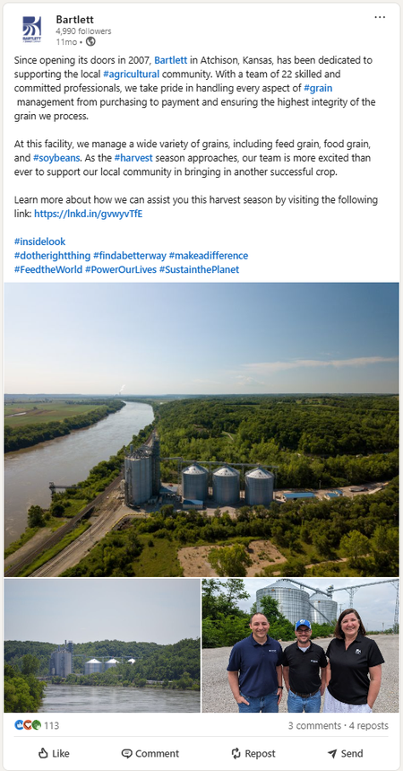 I planned and executed the grand opening of Bartlett's Cherryvale, KS soybean processing plant. We hosted 300+ guests, including Kansas Governor Laura Kelly, Lt. Governor and Commerce Secretary David Toland, U.S. Senator Roger Marshall, and other leaders.